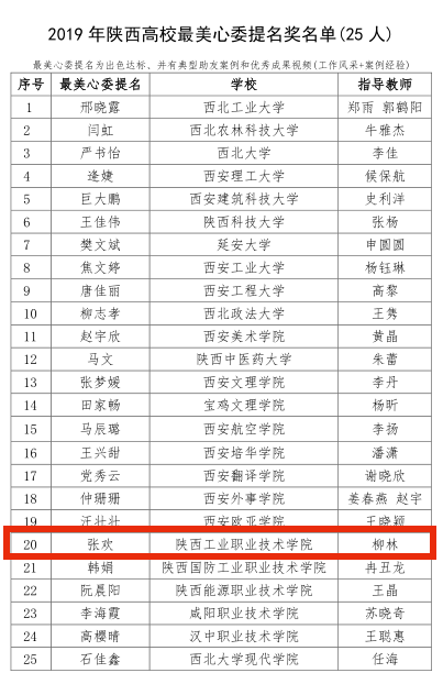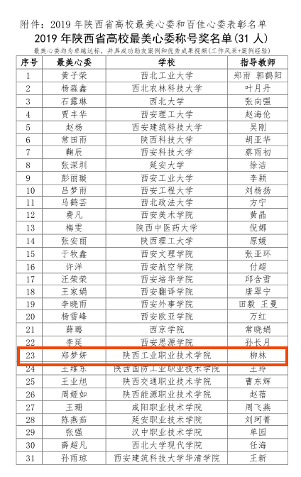 为贯彻教育部《高等学校学生心理健康教育指导纲要》及省教工委心理育人工作部署,加强高校心理委员工作,推展心理助友优秀成果,陕西省高校心理健康教育研究会开展了“2019年陕西省高校最美心委和百佳心委推选活动”。由心理协会会员同时担任班级心理委员的5名同学获得该活动荣誉,分别是材料工程学院质检1801班郑梦妍荣获“最美心委称号奖”,土木工程学院造价1802班张欢荣获“最美心委提名奖”,航空工程学院机器人1802班杨朝阳、土木工程学院工程造价1808班叶启园、财经与旅游学院会计1804班南婷荣获“百佳心委荣誉奖”;柳林老师获优秀指导老师奖。