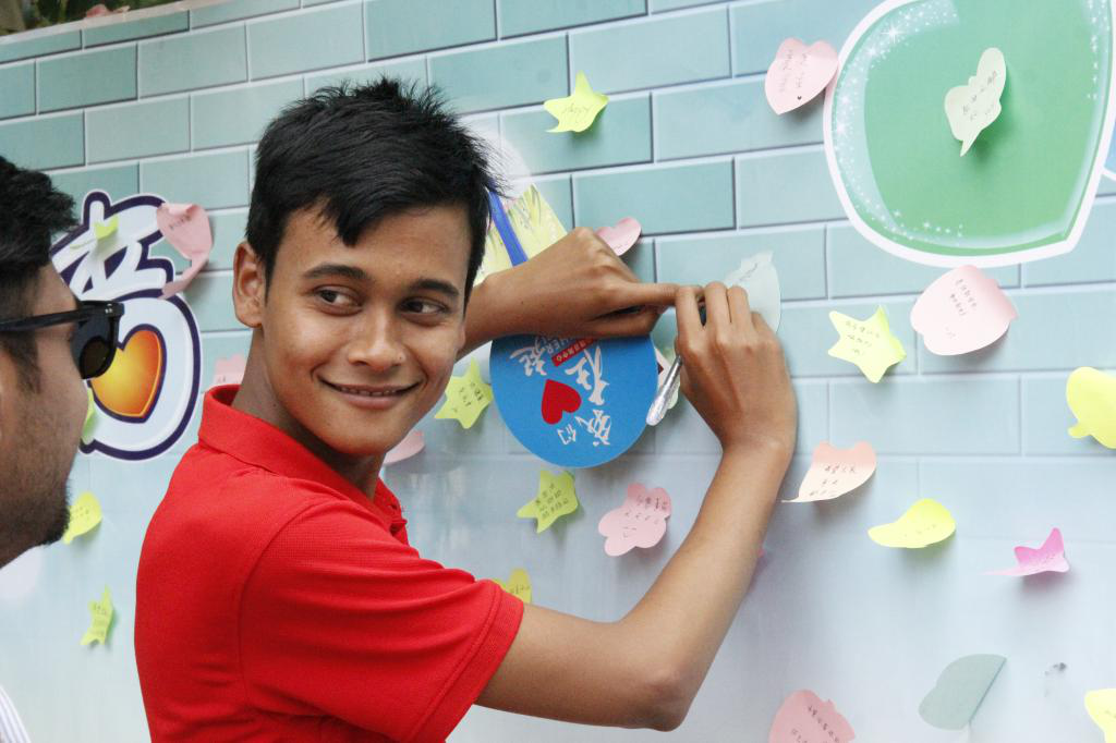 活动现场主题明确、形式多样。本次活动以“闯关卡赢糖果,凭糖果得奖品”的方式进行,活动分为六个体验项目:“心理游戏”由“瞎子背瘸子”“正话反说”“吹乒乓球”“两人三足”和“束腿跳”五个小游戏组成,通过游戏可以培养同学们与他人之间相互信任和配合的能力;“心理测试”邀请同学们现场填写心理量表,用来反映大家的心理承受能力以及心理健康程度;“心灵许愿墙”是让同学们大胆写出自己的愿望,贴在许愿墙上,给同学们带来自信心,体现对美好生活的向往;此外活动当天有三个展览:微笑展、心理手抄报展、心理漫画展,以丰富活动的多样性和趣味性;最后的“奖品兑换”环节,同学们用参与前面体验活动获得的糖果兑换奖品,并愉快的和我们的爱心熊来一个“爱的抱抱”。