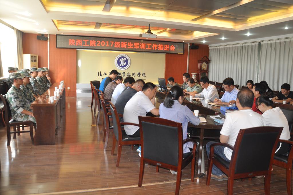 9月11日上午,陕西工院2017级学生军训工作推进会在崇文九楼第一会议室举行。咸阳国防教育训练基地军训团团长闫平,学生处处长、军训团政委王超联,参谋长李明,院团委书记郝平,学生教育管理科科长王康虎,各营营长和各二级学院学工办主任及学生处相关工作人员参加会议。会议由院团委书记郝平主持。