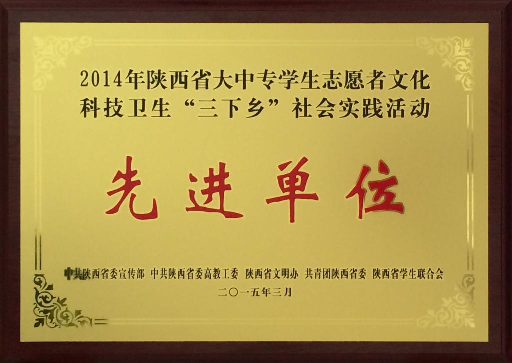 日前,中共陕西省委宣传部、中共陕西省委高教工委、陕西省文明办、共青团陕西省委、陕西省学联联合发文(陕团联发〔2015〕17号),对2014年“三下乡”社会实践活动先进单位进行表彰,我院荣获2014年全省大中专学生志愿者暑期文化、科技、卫生“三下乡”社会实践活动“先进单位”称号。