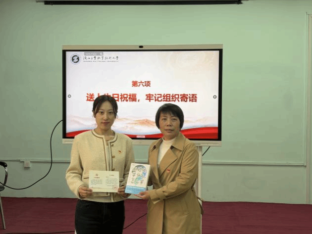 活动最后,在“送上生日祝福,牢记组织寄语”环节,党总支为28名政治生日党员精心准备了“生日礼物”——每人获赠一本经典书籍。书籍涵盖《增广贤文》《论语·大学·中庸》《教育家精神》等,既有中华优秀传统文化的智慧结晶,也有新时代教育工作者精神追求的生动诠释。一本本墨香四溢的书籍,承载着组织的关怀与期望,激励党员们在阅读中涵养党性、厚植情怀、汲取力量。党总支书记在寄语中勉励大家以书为友、以学促行,在各自岗位上持续发挥先锋模范作用,以实际行动践行初心使命。
