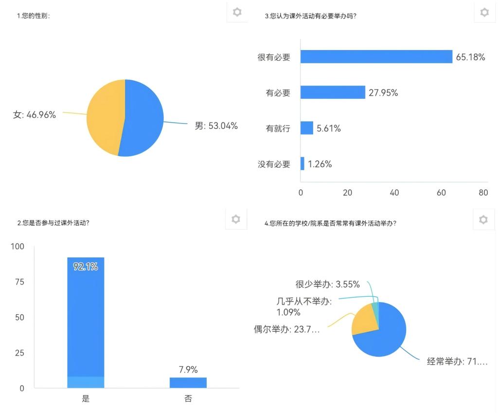 本次问卷调查旨在深入了解同学们对课外活动的参与情况、态度及其影响因素,以便为学校和相关部门提供数据支持,优化课外活动的设计和实施。通过对同学们参与课外活动的动机、频率、偏好及遇到的问题进行系统分析,我们希望能够识别出影响同学们参与度的关键因素,从而为进一步提升课外活动的吸引力和有效性的指导。
