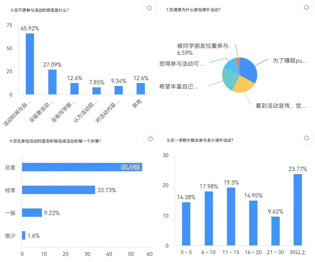 调查结果显示,虽然大部分同学对课外活动持积极态度,并认为其必要性较高,但仍存在部分同学因时间冲突、兴趣缺乏等原因不愿参与。此外,参与活动的动机多样,既有为了获取学分的实用考虑,也有希望丰富课外生活和提升自我的内在驱动。通过这些数据,我们可以更清晰地了解当前课外活动的现状及其改进方向,为未来的活动规划提供更具针对性的建议。