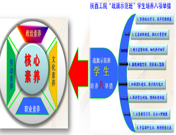 通过两年来的实践、探索,按照“倾注心血筑军魂,提升素养树典范”的指导思想,从政治素养、劳动素养、文化素养和职业素养4个方面打造提升学生综合素养,“战旗示范班”学生的综合素质不断提升,示范效应不断增强。